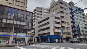 地上にでたら大通りを左に進み、運河を超えて鶴屋町3丁目の歩道橋のある交差点で左へ。